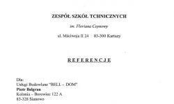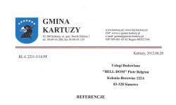"Niniejszym zaświadczam, iż firma Usługi Budowlane "BELL-DOM" Piotr Belgrau zrealizowała na rzecz Gminy Kartuzy roboty budowlane...